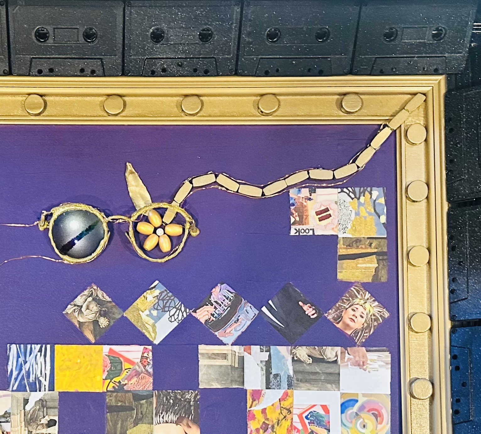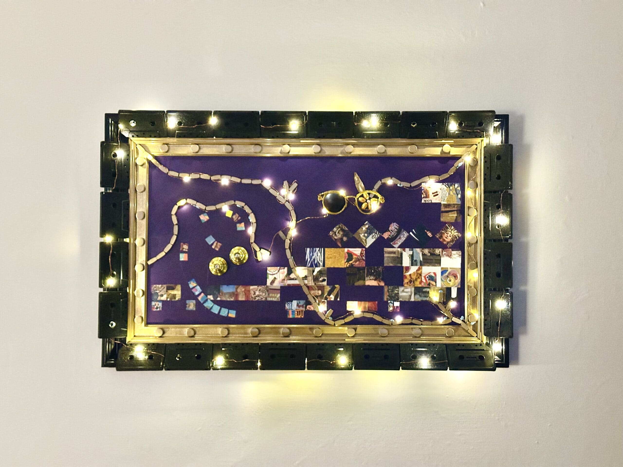Medium: Recycled frame, scrap plywood, recycled beaded placement, recycled bed nobs, recycled cassette tapes, acrylic paint, glitter, wire LED lights, collage.